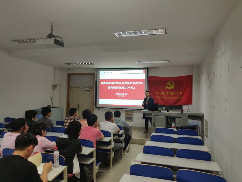 5月26日上午,机械工程学院摩擦学研究所研究生党支部在屯溪路校区格物楼620开展主题为“学史明理,学史增信,学史崇德,学史力行,做有坚定信仰的共产党人”的专题党课,学校党委教师工作部副部长张瑾担任主讲人。