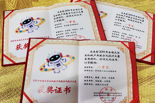 经过国赛的激烈比拼,来自我校3个参赛作品:《多功能月球营地车》(石金明、李厚生、石柯 ,指导教师:朱立红、张良)、《多功能月球自动装卸车》(郭勇、陈浩、关海威,指导教师肖献强、王家恩)、《基于柔索驱动腰下肢康复并联机器人设计》(兰军豪、史裕问、赵一吾 指导教师:訾斌、王正雨) 荣获一等奖,其余两支队伍获二等奖。訾斌、朱立红、张良、肖献强、王家恩、王正雨六位老师被评为“优秀指导教师”。