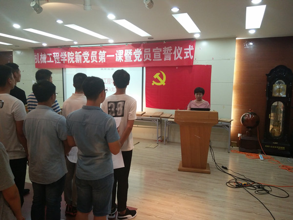 活动在雄壮的国歌中开始,学院辅导员刘洋宣读了《机械工程学院2018年5月新发展党员名单》,在新党员代表张浩同学的领誓下,全体新党员佩戴党徽,面向党旗庄严宣誓。新党员代表李慕茜同学通读了承诺书,随后,全体新党员有序地在《机械工程学院预备党员承诺书》上签字,表达了在未来学习、工作和生活等方面对自身严格要求的决心和信念。新党员代表韩敬伟和老党员代表郑雨先后作了交流发言。