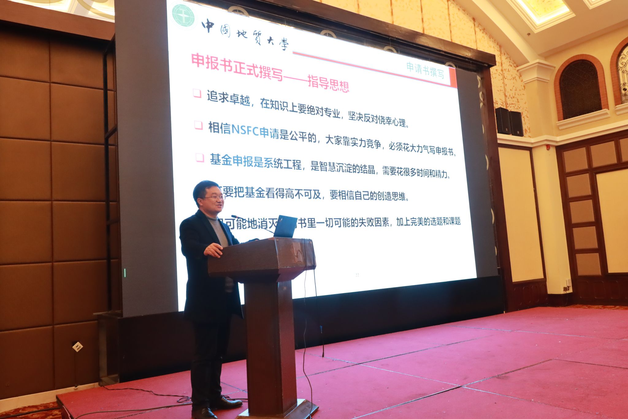 会议第二单元主要围绕2024年度国家自然科学基金申报进行交流研讨。訾斌院长在分析与总结学院学科建设与科研工作的基础上,进一步强调了国家自然科学基金申请工作的重要性,并对2024年的基金申报工作提出了具体要求。学院邀请了中国地质大学(武汉)丁华锋教授和苏州大学朱忠奎教授,围绕基金申报书撰写、青年教师科研道路规划等问题进行报告与交流,特别从科研选题、关键科学问题凝练、基金申报书撰写等多个方面进行了详细指导。丁华锋教授结合自身的基金申报经验,详细介绍了基金申请书的写作思路和注意事项;朱忠奎教授重点围绕基金选题和思路形成进行了介绍,并就申请书的形式与逻辑进行了精彩分享和深入交流。与会教师与特邀专家就基金申报中的具体问题进行了热烈讨论和交流。张显东书记在会议总结时进一步要求学院各位教师积极准备,做好2024年度的国家自然科学基金申请工作,力争取得优异成果。