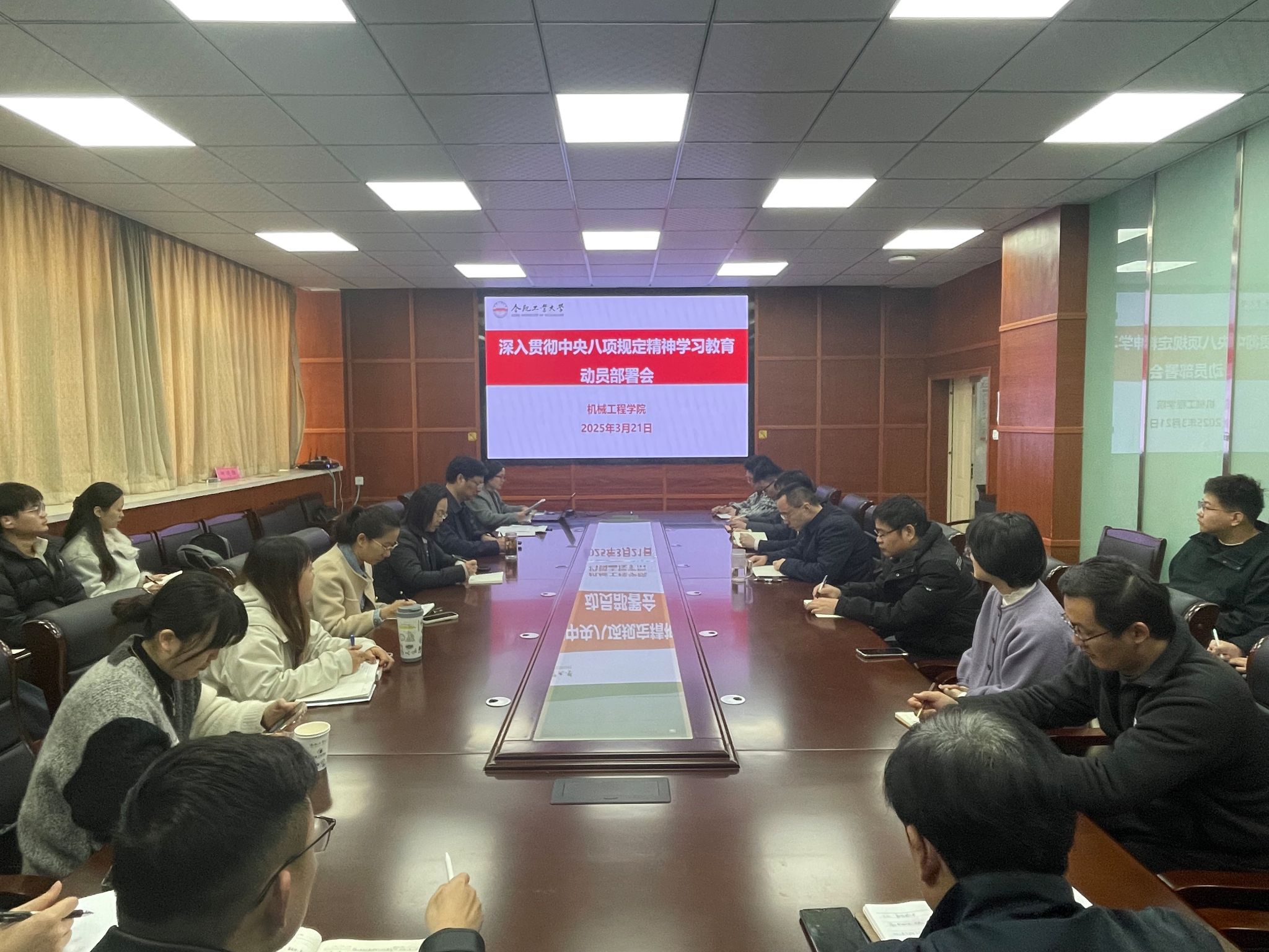 3月21日,机械工程学院党委在格物楼308会议室召开深入贯彻中央八项规定精神学习教育工作动员部署会,传达学习中央党的建设工作领导小组会议精神和中共中央办公厅、教育部党组关于开展深入贯彻中央八项规定精神学习教育有关要求、学校党委部署深入贯彻中央八项规定精神学习教育工作会议精神,全面部署学院深入贯彻中央八项规定精神学习教育工作。学院党委书记祖磊作动员部署讲话,学院党委副书记兼纪委书记蔡伟伟主持会议,学院处级领导干部、科级干部、党委委员、纪委委员、党支部书记和支部纪检委员参加动员部署会。